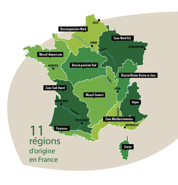 En France, 11 régions d’origine, appelées zones biogéographiques, ont été établies à partir d’éléments hydrographiques, climatiques, géologiques, etc.
